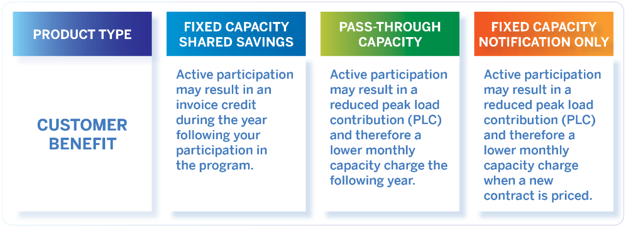 - For pass-through capacity customers—a reduced peak load contribution (PLC) and therefore a lower monthly capacity charge the following year